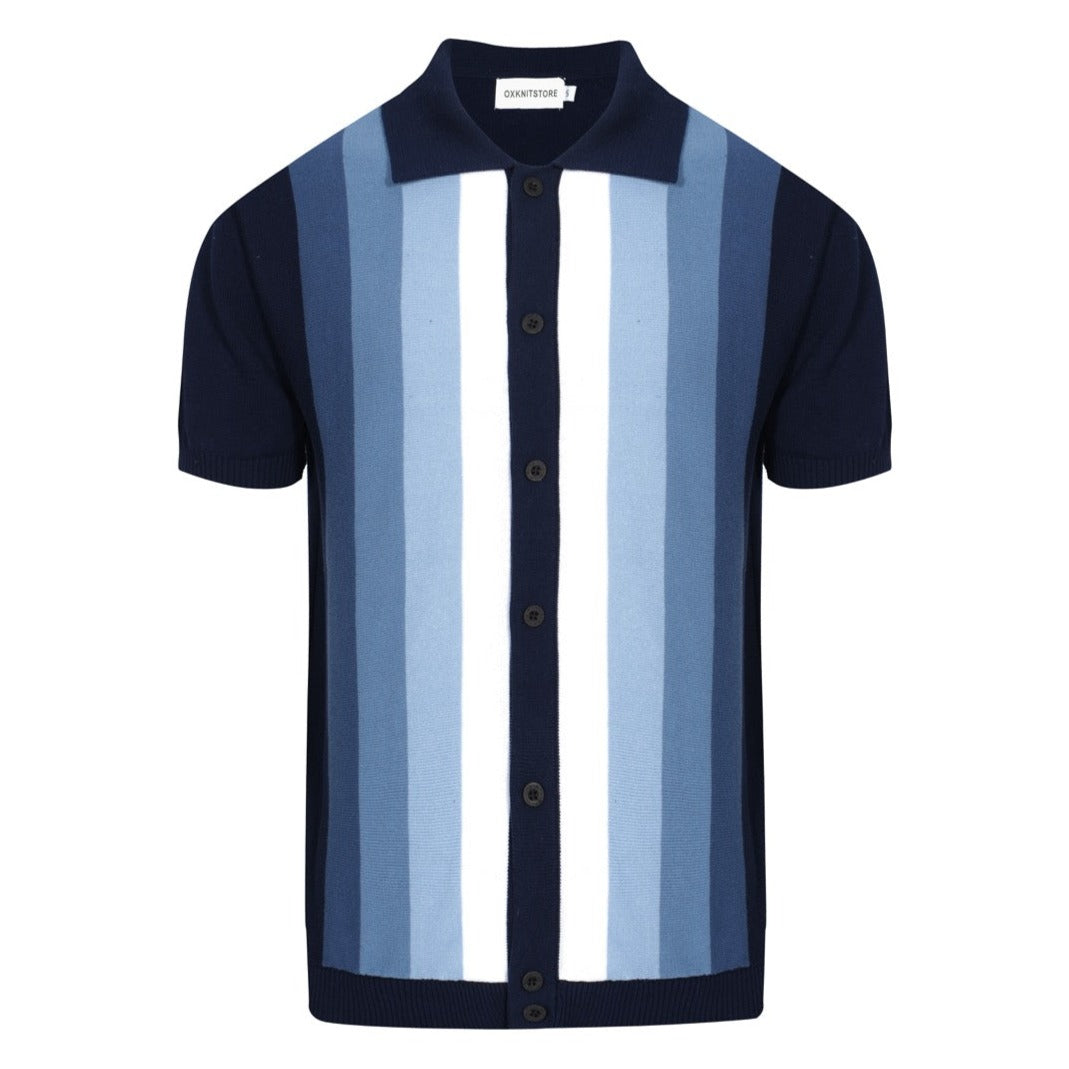 Step into classic MOD style with this vertical striped knitted shirt. Featuring deep navy blue, sky blue, and bright white stripes arranged in a symmetrical contrast, this piece evokes the confident cool of 1960s London.