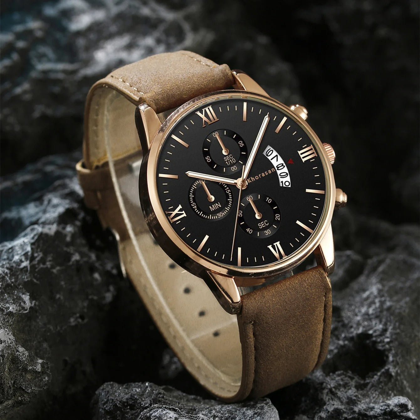 The gift he will cherish forever — This 3-piece set is thoughtfully designed to elevate any man's style. Featuring a timeless quartz watch with a classic leather strap, classic aviator sunglasses, and a sleek leather wallet, this collection is crafted to make a strong impression in any setting.
