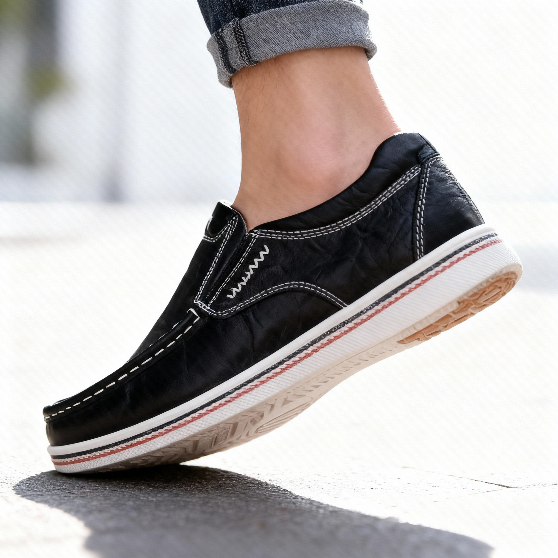 Some shoes speak softly—these ones have a voice. Made from full-grain leather, they feature the sleek lines of a loafer with the pleasant feel of your favourite trainers. The distinctive stitching and sporty striped sole make them hard to ignore, and their slip-on design makes them even harder to take off.