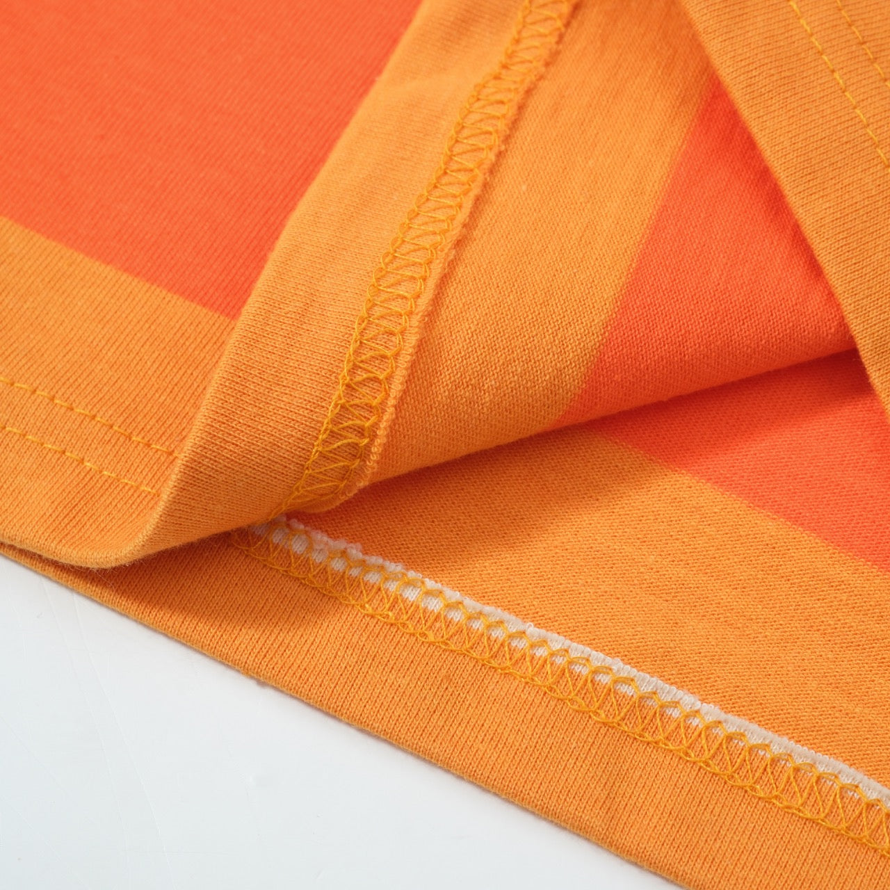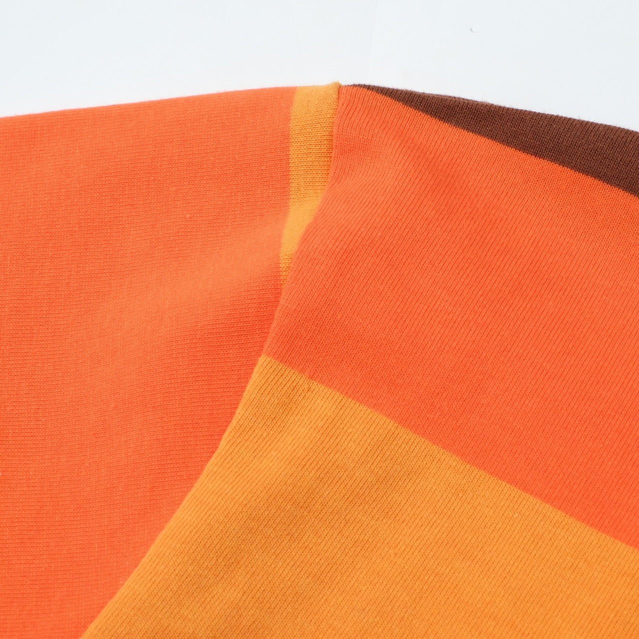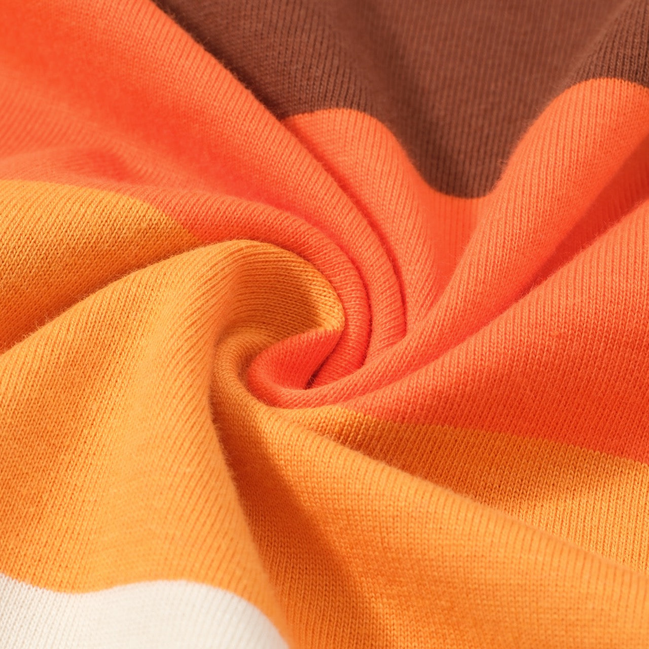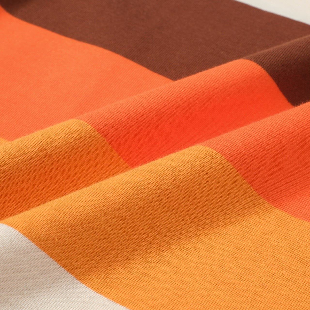 Channel pure 70s nostalgia with this soft knit t-shirt, featuring horizontal stripes in burnt orange, golden yellow, chocolate brown, and cream. The warm, saturated tones evoke endless summer days and laid-back California vibes.