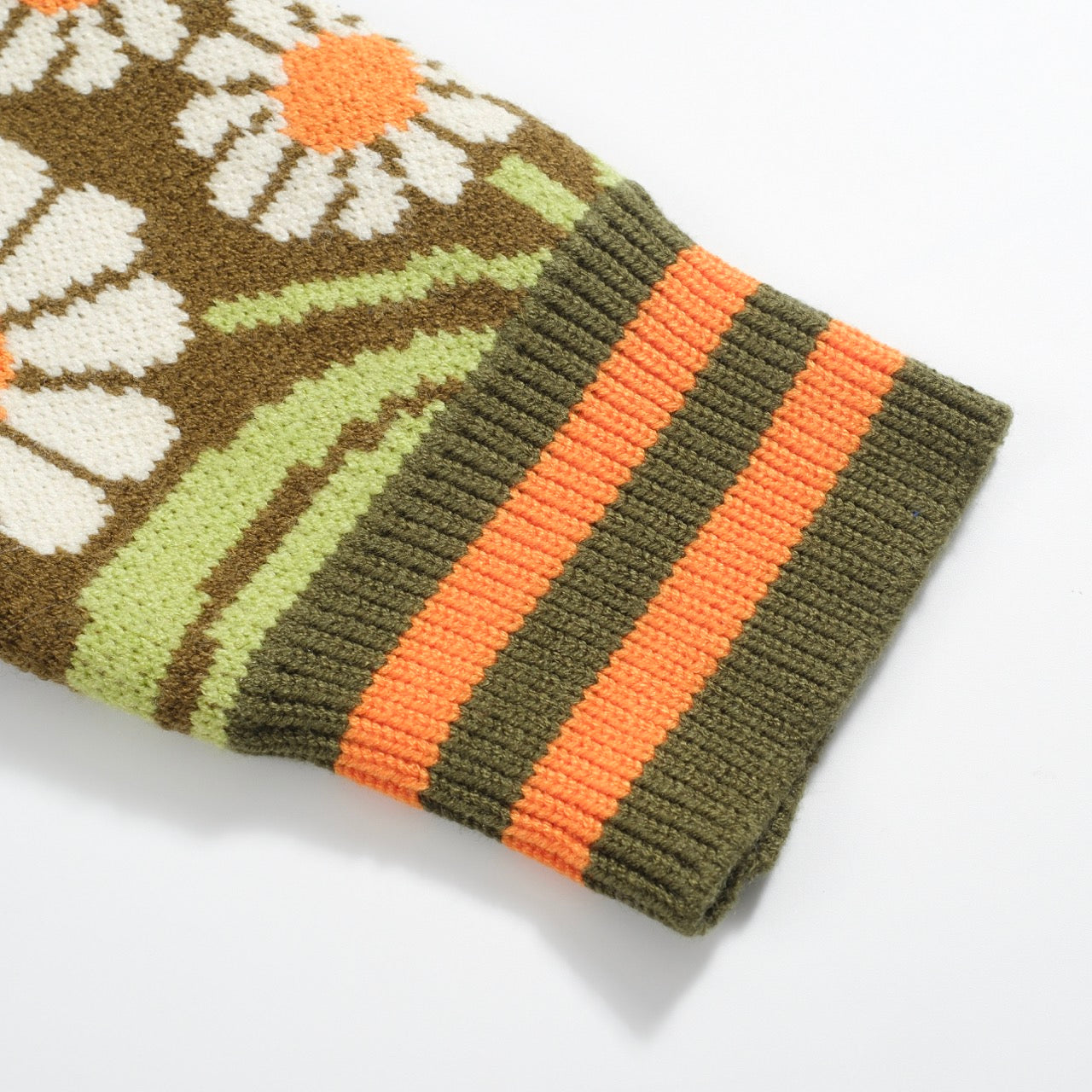 Turn heads with this olive green zip-up cardigan for men, featuring a playful daisy pattern in white and orange. Inspired by vintage 1970s flowers and MOD aesthetics, this knit is made from a breathable medium-weight yarn, perfect for layering throughout the year.
