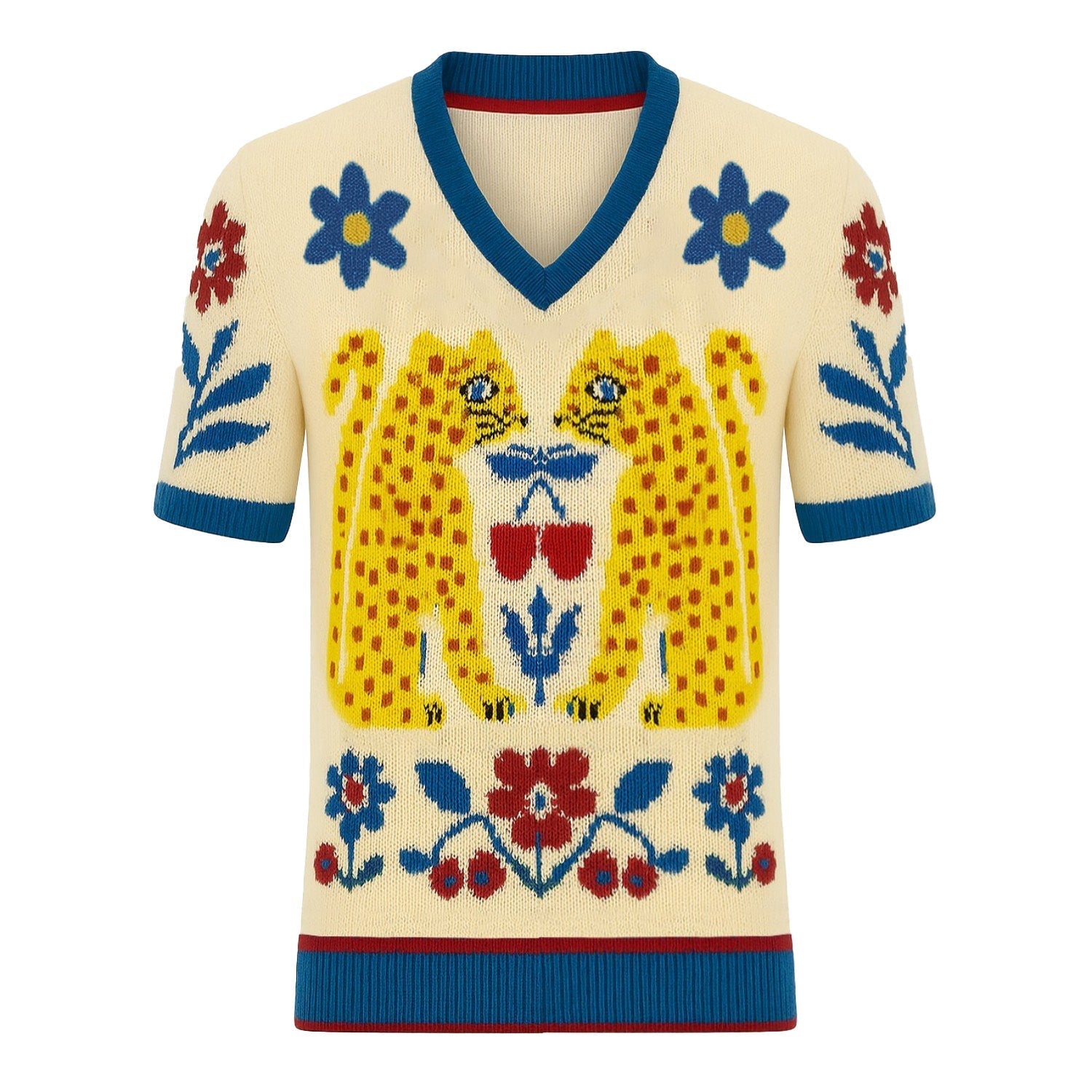 Vintage jacquard animal print apricot knitted T-shirt for men